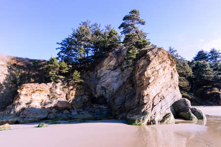 Tranquil beach in the southern Oregon coast known as Secret Beach with beautiful Islets topped with evergreen trees on a beautiful sunny day