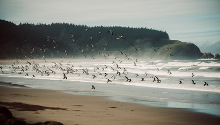 This breathtaking aerial photo captures the tranquil ocean waves lapping against a sandy beach, embraced by coastal mountains under a serene foggy sky.
