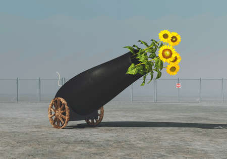 Flowers out of a cannon . Think outside the box concept . Different approach and mindset . Launch startup concept . This is a 3d render illustration .