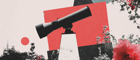 Minimalist collage of a telescope exploring the universe against a geometric floral backdrop