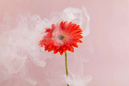 Closeup shot of one gerbera flower over dark background in neon light. Concept of floristry, decorations, creativity, decor and ad