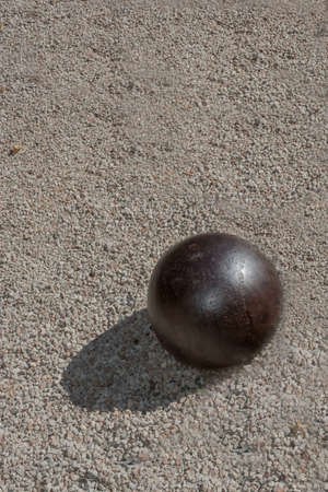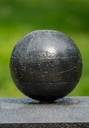 Cannonball stayed on old medieval wall after bombing against a blue horizon over the sea.