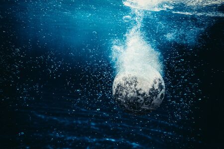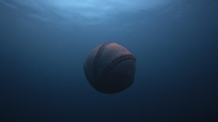 A unique image of a baseball floating in deep underwater, surrounded by serene dark blue water illuminated by sunlight, capturing the essence of natural beauty.