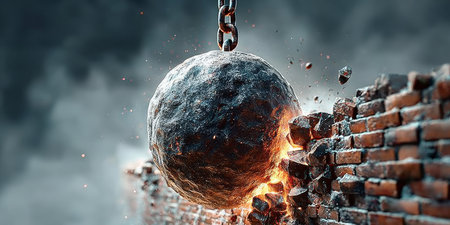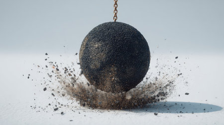 The Powerful Impact of a Giant Wrecking Ball on a Building, Destroying Walls with Forceful Momentum