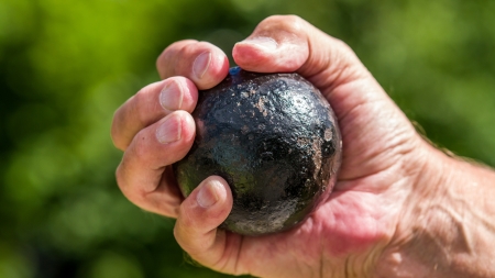 A black ball with a rough surface sits on a black surface. The ball is surrounded by green grass.