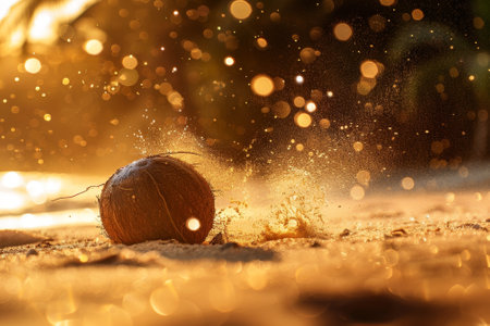 A detailed image of a coconut falling towards a sandy beach, water droplets flying off it