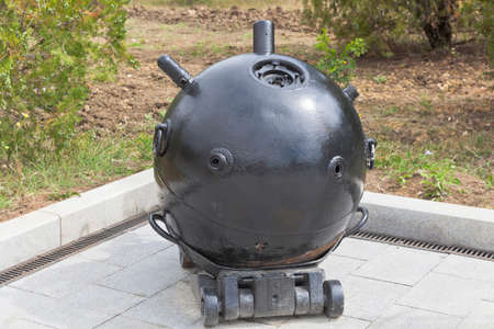 Sevastopol, Crimea, Russia - July 28, 2020: Marine galvanic impact anchor mine of the 1908/1939 model in the memorial complex Sapun Gora in the hero city of Sevastopol, Crimea
