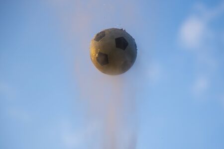 A soccer ball bursts through debris, sending dust and particles flying in an urban environment. This dynamic scene captures the energy and excitement of play in action.