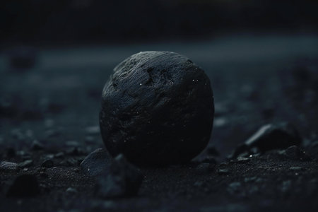 line of smooth, dark spheres sits on a dusty, textured surface, with a soft, ethereal glow emanating from behind.
