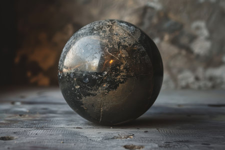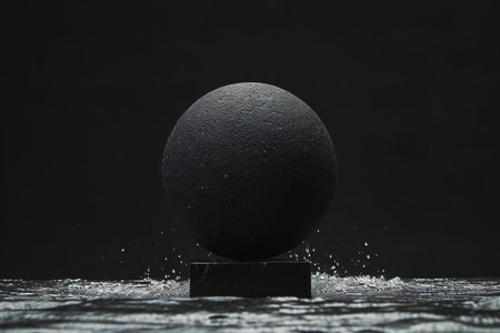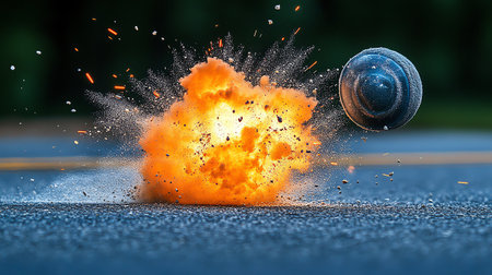 Dark sphere, textured with small protrusions, is shown impacting a light-colored surface. The impact causes a powerful explosion of dark fragments and dust, dispersing outward. The image has a dramatic and realistic quality, emphasizing the force and energy of the collision.