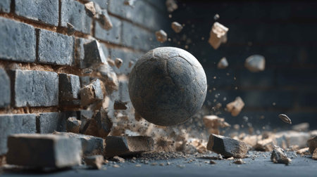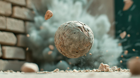 A dynamic scene depicting a soccer ball breaking through a wall, capturing the moment of impact with flying dust and debris, showcasing action and energy.