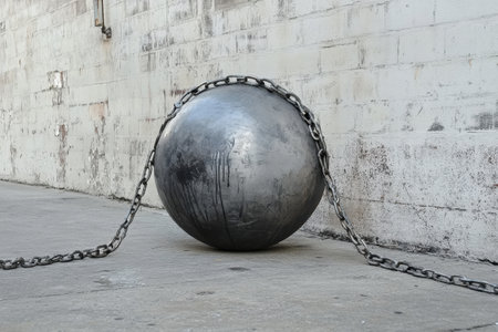 A large metallic sphere is secured by a thick chain in an alley. The smooth surface of the ball reflects light, while rough concrete surrounds it on a sunny day.
