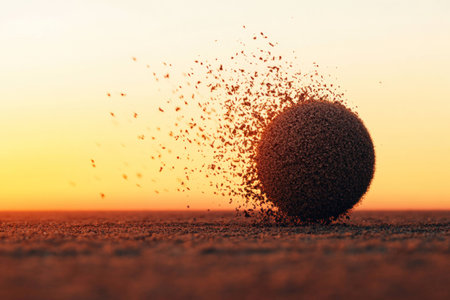 Abstract sand sphere dissolving in sunset light, representing change and transformation in nature and art