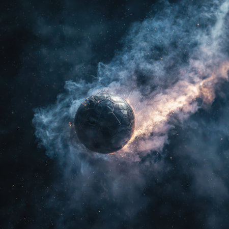A ball bursts into space, leaving a trail of glowing fire and smoke as stars start to twinkle around it, creating a dramatic scene.