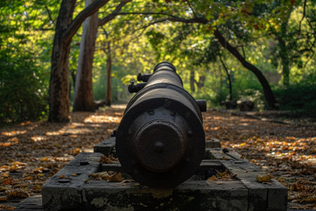 Vintage cannon in a wooded area, with sunlight filtering through trees