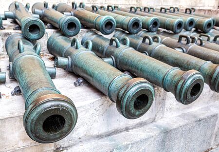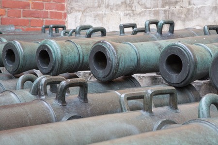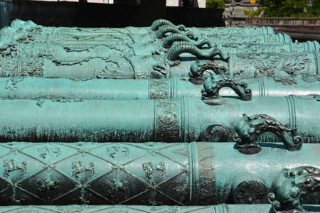 Moscow, Russia - July 9, 2019: Russian ancient field bronze cannons 17th - 18th centuries on the territory of the Moscow Kremlin