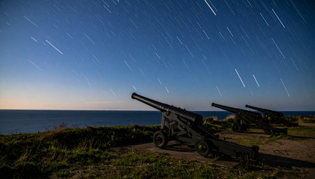 Silent coastal cannons stand guard under a celestial display of streaking star trails. This long-exposure nightscape captures the passage of time, blending historical defense with the infinite beauty of the universe, evoking a sense of timeless vigilance and serene power.
