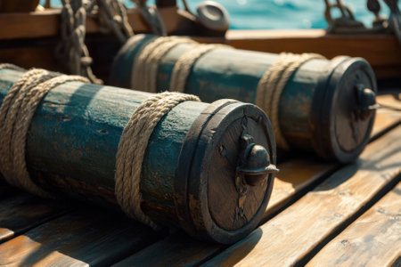 interior view of Cannons At The Deck and Cannon Balls plus windows on old galleon with ropes