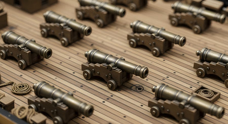 A close-up view of rows of miniature bronze cannons on the wooden deck of a historical model sailing ship. The image highlights the intricate detail and craftsmanship involved in the hobby of model building.