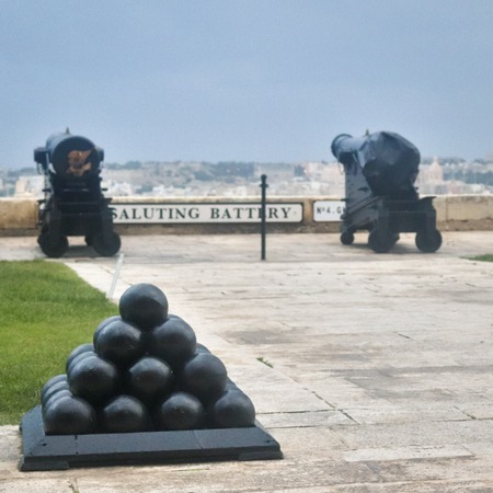 Two heavy Guns and saluting battery in the upper barrakka gardens. In the foreground a pyramid of cannonballs.