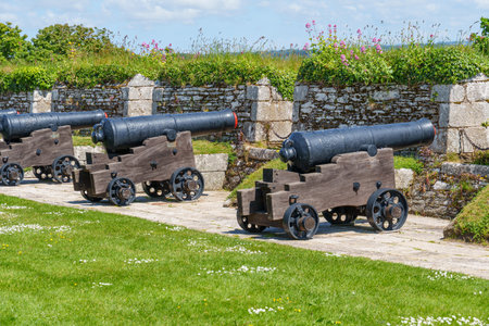 Falmouth, Cornwall, England - July 25, 2018: Big gun at Pendennis Castle in Cornwall, England. Pendennis castle was first commissioned by King Henry VIII in response to invasion threats from the continent. Pendennis was built on the mouth of the River Fa