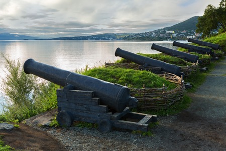 Petropavlovsk-Kamchatsky, Russia - August 14, 2016: Cast iron guns at the location of the third battery Maksutova in the city of Petropavlovsk-Kamchatsky.