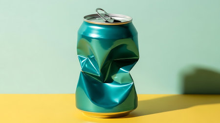 Crumpled green soda can on a yellow surface with a light green background and shadow to the right.