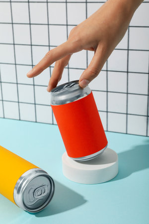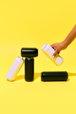 Minimalistic mockup with black and white cans on yellow background, with hand picking up one can. Beer, lemonade, soda water, energy drinks packaging.