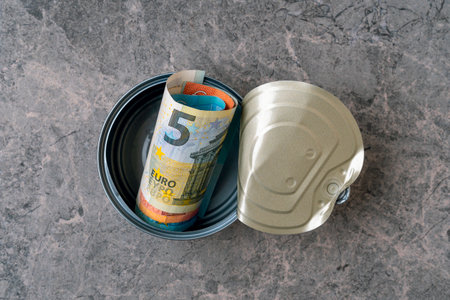 Top view of open tin can with a roll of Euro banknotes. Financial concept image.