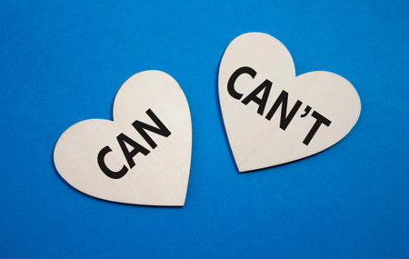 Can or Cant symbol. Concept word Can or Cant on wooden hearts. Beautiful blue background. Business and Can or Cant concept. Copy space