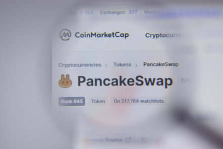 New York, USA - 1 May 2021: PancakeSwap CAKE cryptocurrency logo close-up on website page, Illustrative Editorial