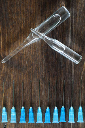 Ampoule and needles from a medical syringe on wooden background