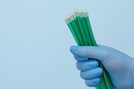 Hand in blue glove holding the tubes for DNA samples analysis.