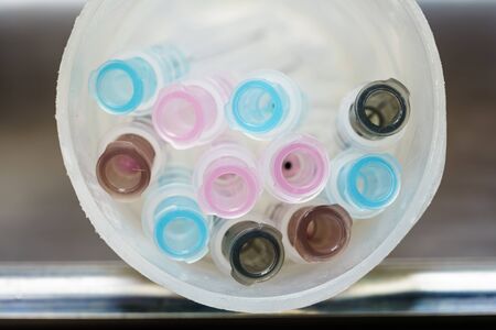 Plastic test tubes with caps for the collection of samples. Blood sampling tubes.