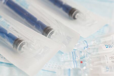 Several syringe on white table prepared for injection in hospital, selective focus, DOF, macro