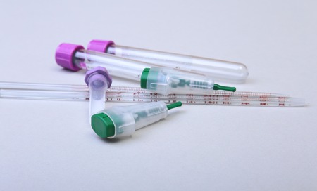 horizontal white background with copy space with medical material consisted in test tubes, tourniquete and needle for blood collection