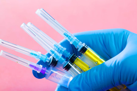 syringes in hand on a pink background, close-up