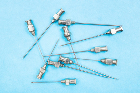 pile of vintage steel hypodermic needles on blue paper background close up
