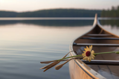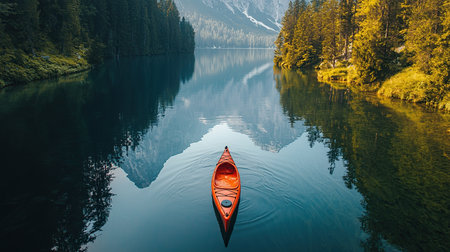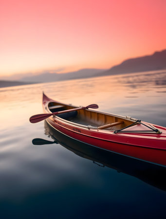 Kayak floating on calm lake at sunrise with scenic mountain reflection in peaceful outdoor setting