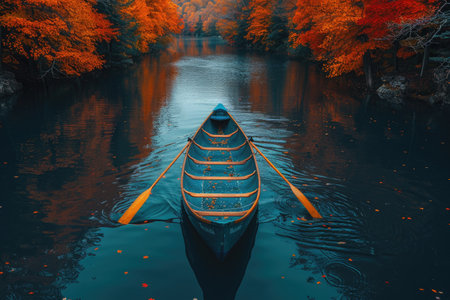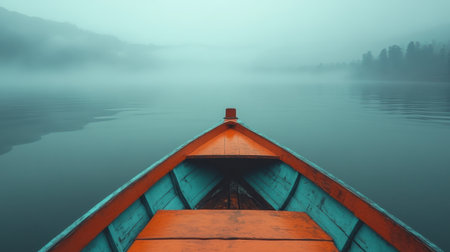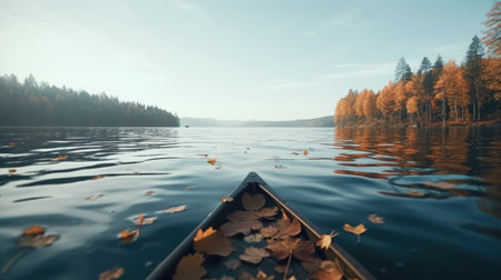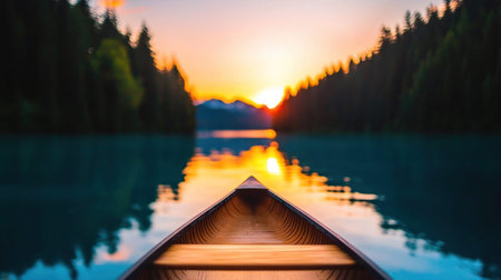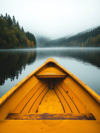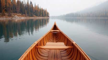 A breathtaking view from the bow of a wooden canoe gently floating on a calm lake, framed by autumn foliage and misty mountains, ideal for peaceful escapes in nature.