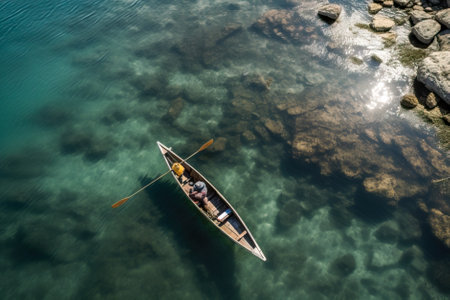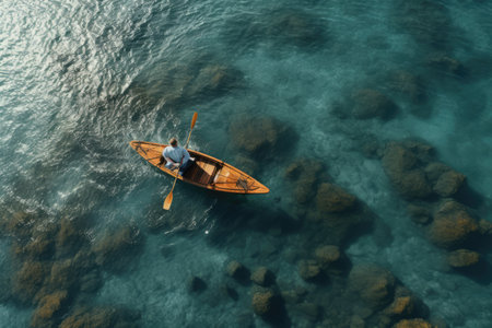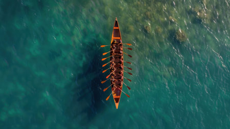 Aerial view of rowing boat with multiple oarsmen navigating through clear turquoise water, showcasing teamwork and harmony in motion. vibrant colors create serene and captivating scene