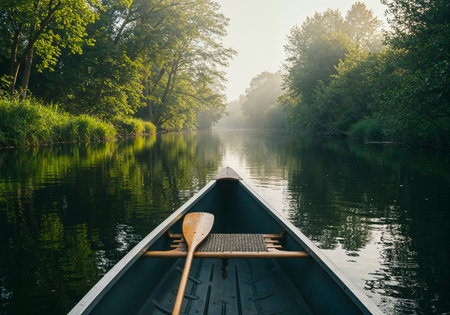 AI Generated. Closeup bow of a modern canoe in the misty lake or river around forest