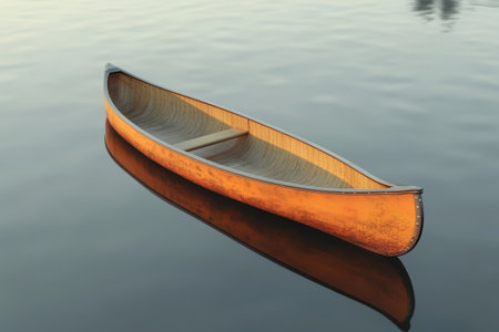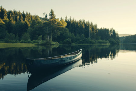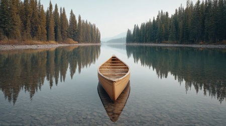 A tranquil scene featuring a wooden canoe gently floating on a still lake, surrounded by towering green trees, reflecting beautifully in the clear water. Perfect for nature lovers.