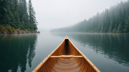 A wooden canoe glides on a tranquil lake, surrounded by lush evergreen trees and a misty atmosphere. Peaceful scene.