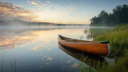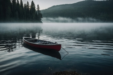 A beautiful wooden canoe rests on a calm lake, surrounded by tall pine trees and enveloped in mist, creating a peaceful and serene atmosphere for nature lovers.