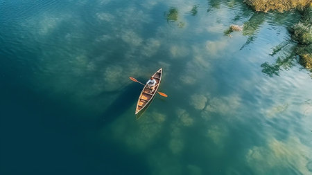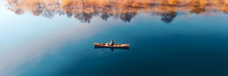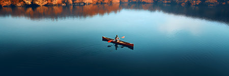 Aerial view of a man in a kayak paddling in the sea, Person rowing on a calm lake in autumn, aerial view only small boat visible with serene water around, AI generated