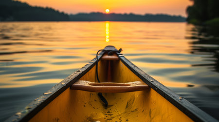 A stunning view of a canoe at rest on a peaceful lake at sunset, with calm waters reflecting the colors of the sky and a wooden dock inviting tranquility and adventure.