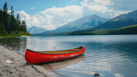 A captivating image of a canoe resting on the shore of a mountain lake, with stunning reflections of the surrounding mountains and trees in the water, inviting outdoor enthusiasts to explore.