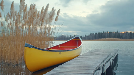 A vibrant yellow canoe rests peacefully at a wooden dock by a serene lake. Tall reeds sway gently, reflecting a stunning sunset sky. Perfect for nature lovers.