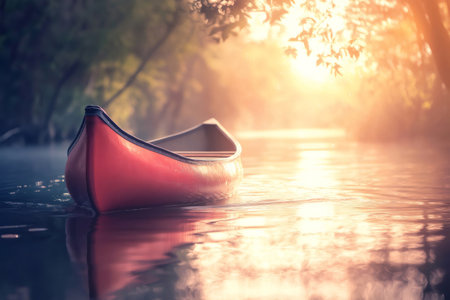 Red canoe floating on a river during a golden sunset, creating a serene and peaceful atmosphere